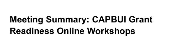 This document is a Meeting Summary of the CAPBUI Grant Readiness Online Workshops. The workshop's primary objective was to prepare participating organizations for successful grant applications by outlining the key documents and policies necessary to demonstrate compliance, accountability, and credibility to potential donors