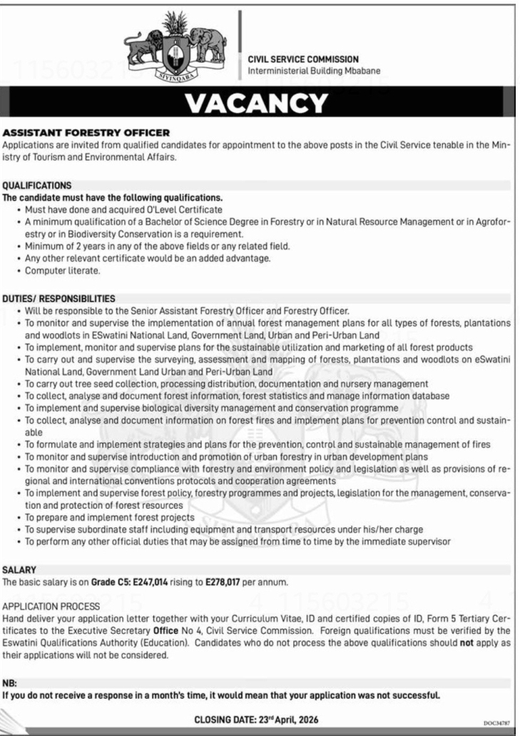 Hand deliver your application letter together with your Curriculum Vitae, ID and certified copies of ID, Form 5 Tertiary Certificates to the Executive Secretary Office No 4, Civil Service Commission. Foreign qualifications must be verified by the Eswatini Qualifications Authority (Education). Candidates who do not possess the above qualifications should not apply as their applications will not be considered.
