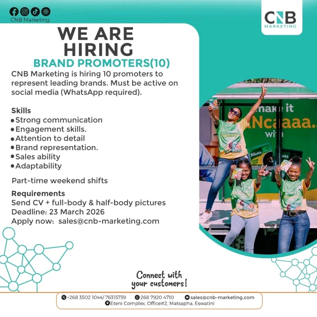 CNB Marketing is hiring 10 promoters to represent leading brands. Must be active on social media (WhatsApp required).