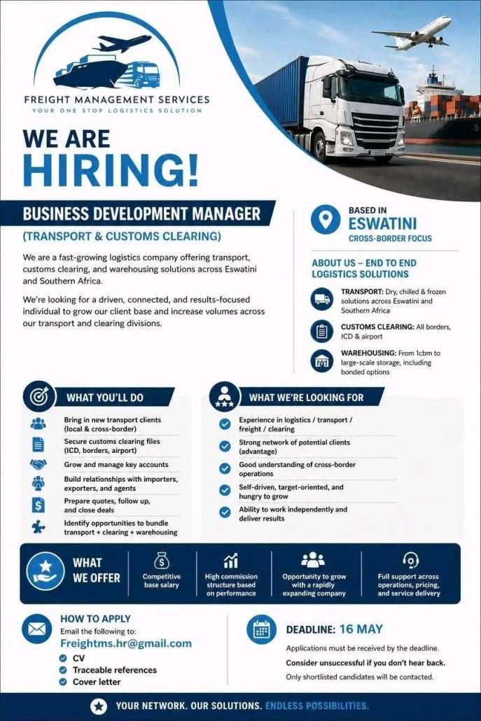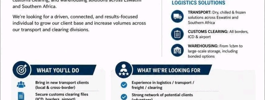 We are a fast-growing logistics company offering transport, customs clearing, and warehousing solutions across Eswatini and Southern Africa.