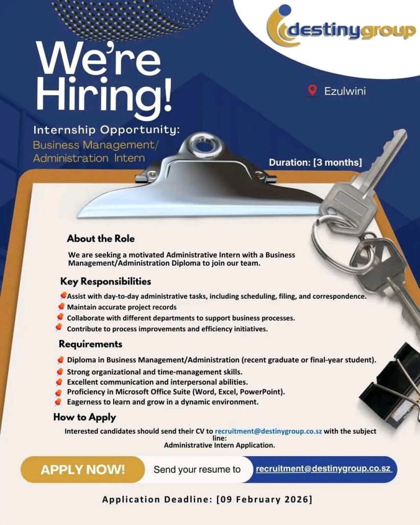 How to Apply Interested candidates should send their CV to recruitment@destinygroup.co.sz with the subject line: Administrative Intern Application.