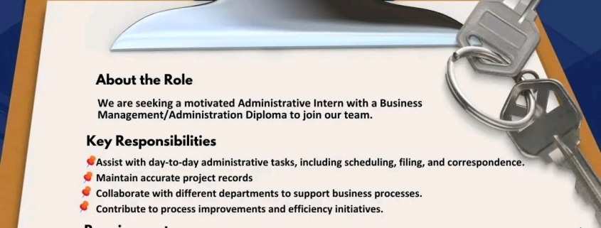 About the Role We are seeking a motivated Administrative Intern with a Business Management/Administration Diploma to join our team.