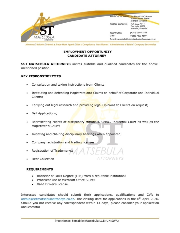 Interested candidates should submit their applications, qualifications and CVs to admin@sstmatsebulaattorneys.co.sz.