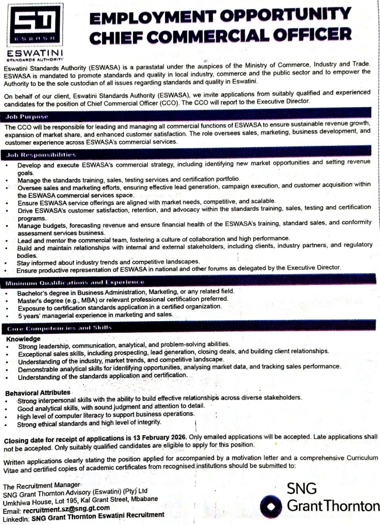 On behalf of our client, Eswatini Standards Authority (ESWASA), we invite applications from suitably qualified and experienced candidates for the position of Chief Commercial Officer (CCO). The CCO will report to the Executive Director.