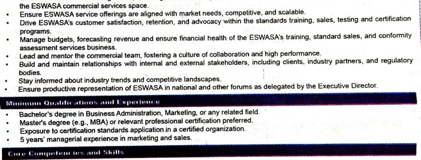 The Chief Commercial Officer will be responsible for leading and managing all commercial functions of ESWASA to ensure sustainable revenue growth, expansion of market share, and enhanced customer satisfaction. The role oversees sales, marketing, business development, and customer experience across ESWASA’s commercial services.