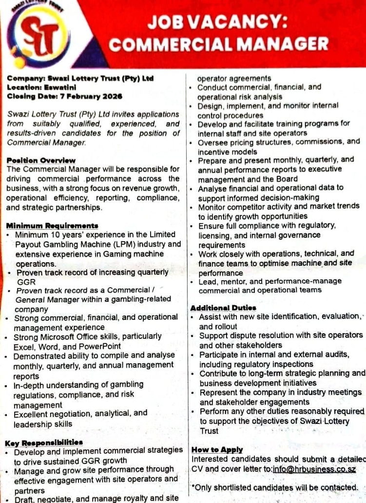 Swazi Lottery Trust (Pty) Ltd invites applications from suitably qualified, experienced, and results-driven candidates for the position of Commercial Manager.