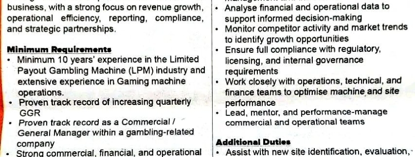 • Minimum of 10 years’ experience in the Limited Payout Gambling Machine (LPM) industry and extensive experience in gaming machine operations