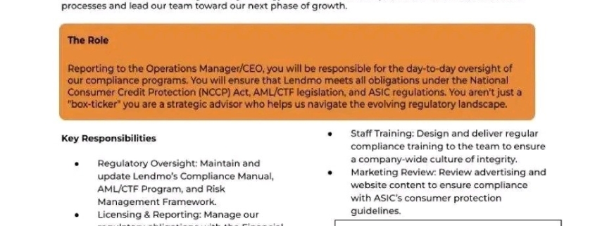 The RoleReporting to the Operations Manager/CEO, you will be responsible for the day-to-day oversight of our compliance programs. You will ensure that Lendmo meets all obligations under the National Consumer Credit Protection (NCCP) Act, AML/CTF legislation, and ASIC regulations. You aren’t just a “box-ticker” you are a strategic advisor who helps us navigate the evolving regulatory landscape.