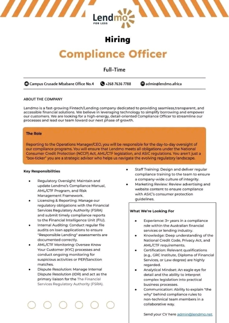 - Regulatory Oversight: Maintain and update Lendmo’s Compliance Manual, AML/CTF Program, and Risk Management Framework.