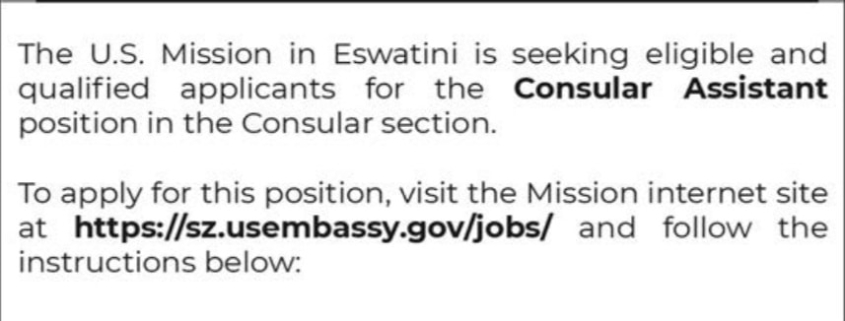The U.S. Mission in Eswatini is seeking eligible and qualified applicants for the Consular Assistant position in the Consular section.