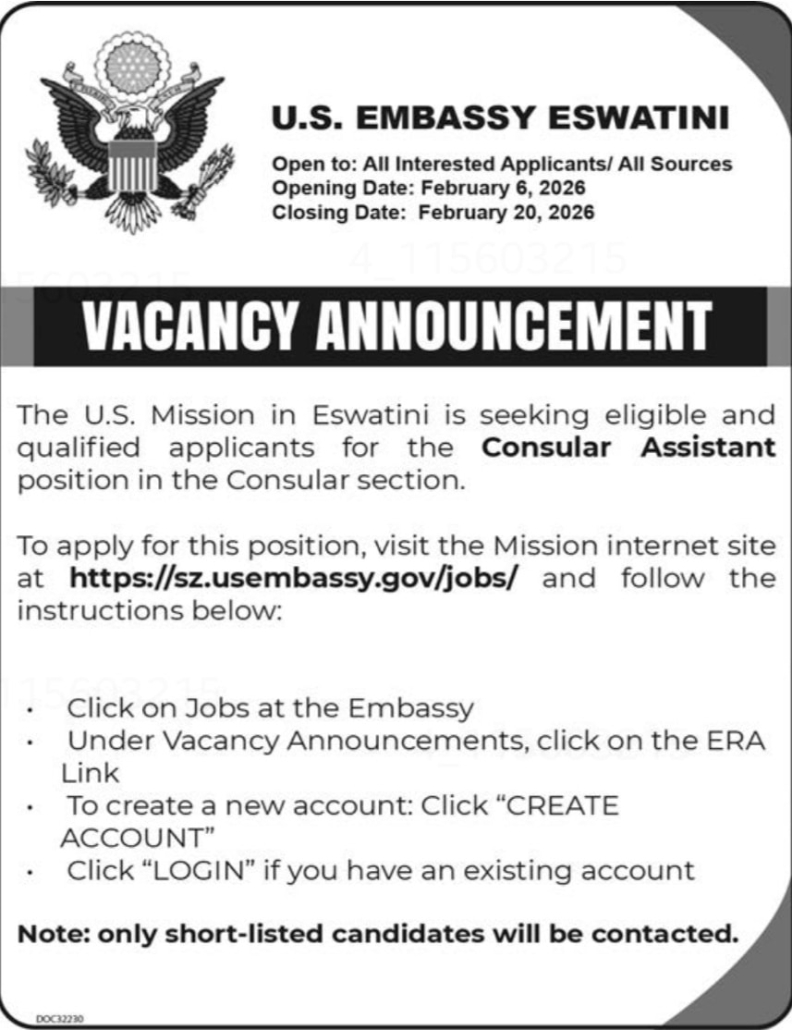 The U.S. Mission in Eswatini is seeking eligible and qualified applicants for the Consular Assistant position in the Consular section.