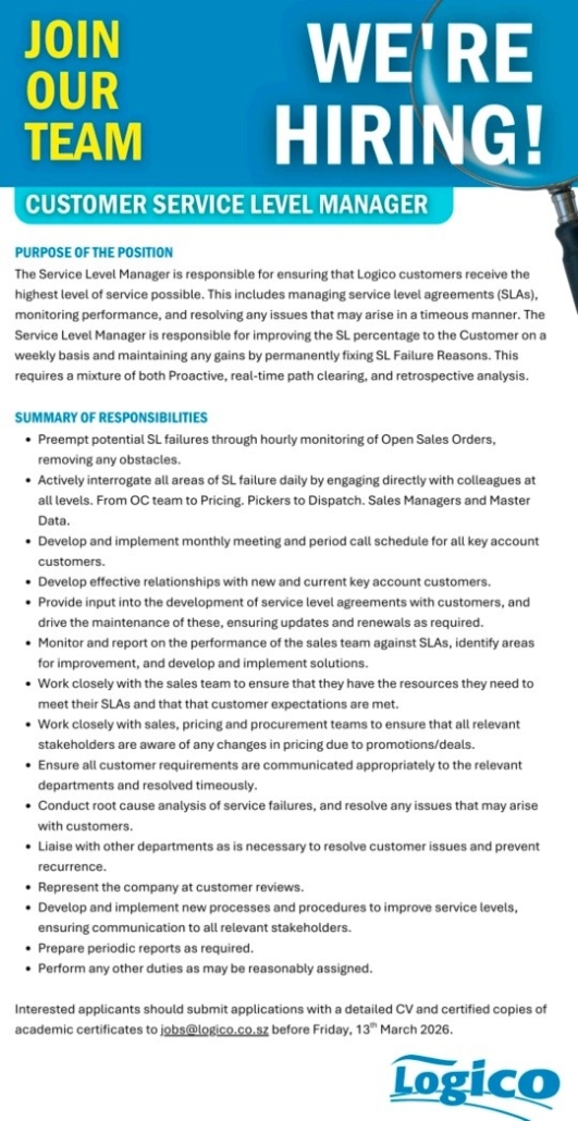 The Service Level Manager is responsible for ensuring that Logico customers receive the highest level of service possible. This includes managing service level agreements (SLAs), monitoring performance, and resolving any issues that may arise in a timeous manner. The Service Level Manager is responsible for improving the SL percentage to the Customer on a weekly basis and maintaining any gains by permanently fixing SL Failure Reasons. This requires a mixture of both proactive, real-time path clearing, and retrospective analysis.