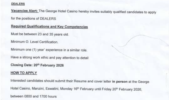 Interested candidates should submit their Resume and cover letter in person at The George Hotel Casino, Manzini, Eswatini, Monday 16th February until Friday 20th February 2026, between 0800 and 1700 hours.