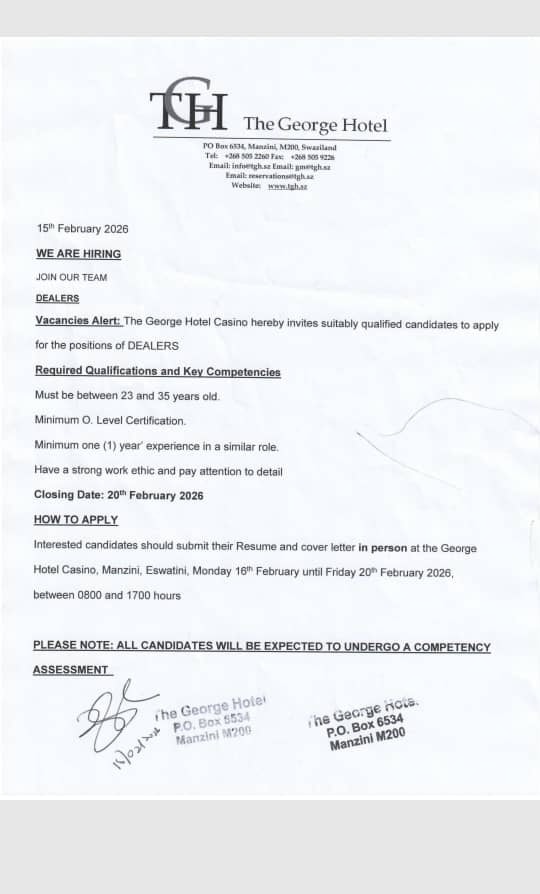 Interested candidates should submit their Resume and cover letter in person at The George Hotel Casino, Manzini, Eswatini, Monday 16th February until Friday 20th February 2026, between 0800 and 1700 hours.
