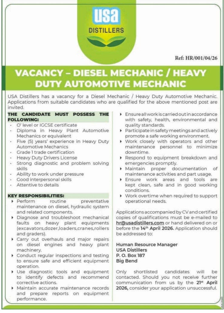 USA Distillers has a vacancy for a Diesel Mechanic / Heavy Duty Automotive Mechanic. Applications from suitable candidates who are qualified for the above mentioned post are invited.