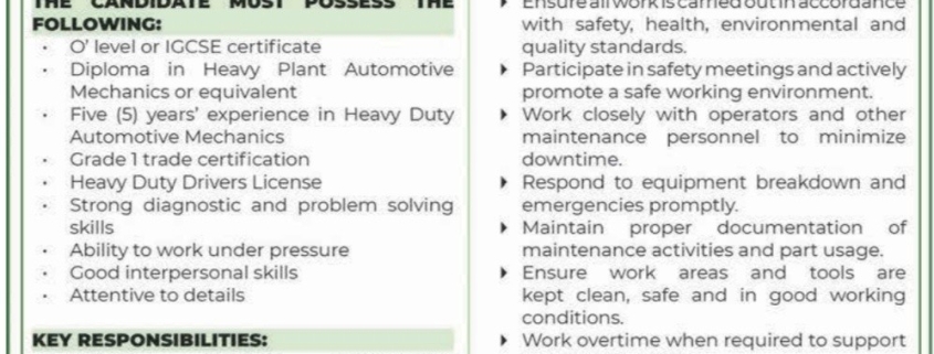 - Diploma in Heavy Plant Automotive Mechanics or equivalent