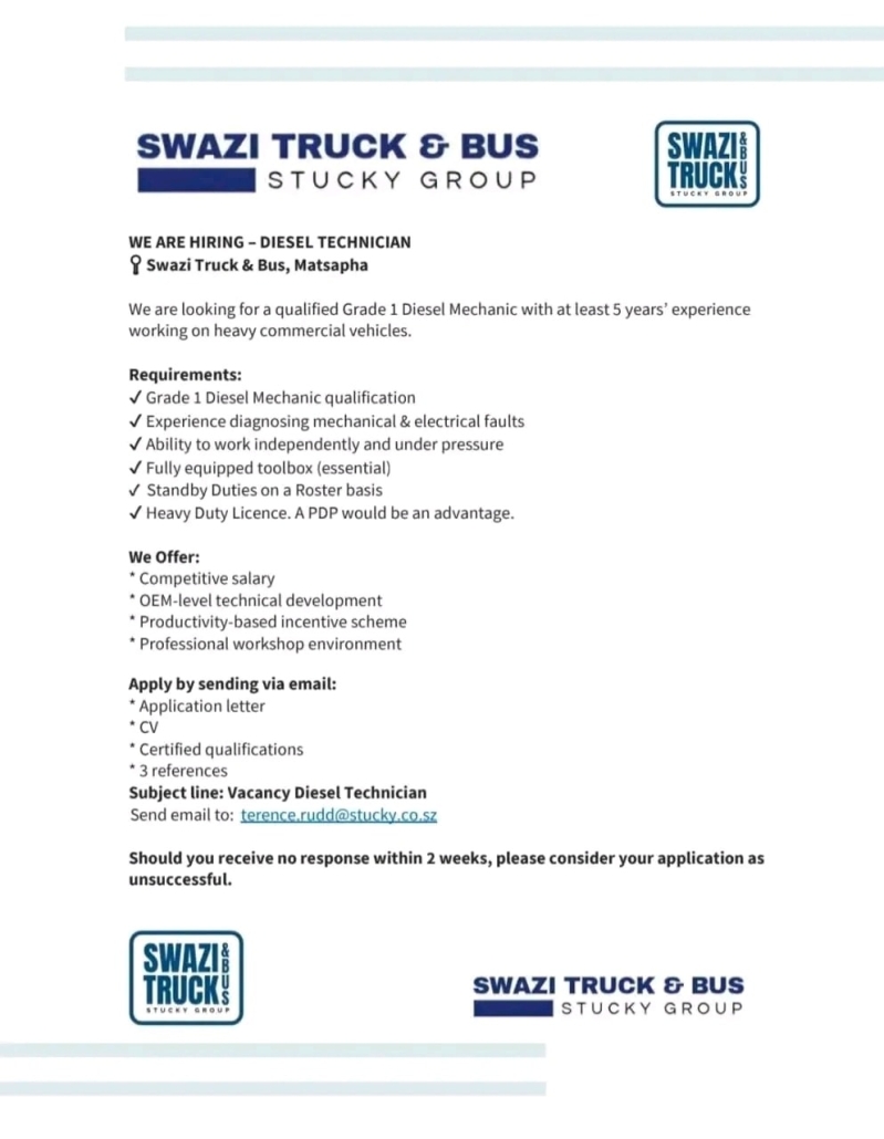 We are looking for a qualified Grade 1 Diesel Mechanic with at least 5 years’ experience working on heavy commercial vehicles.