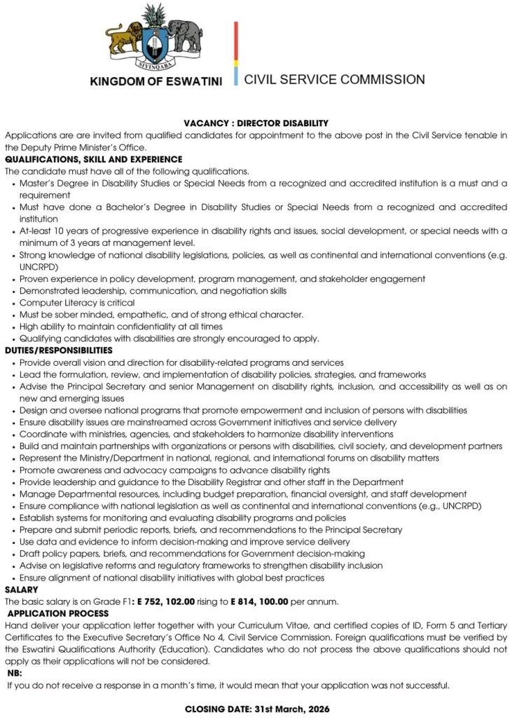 Hand deliver your application letter together with your Curriculum Vitae, and certified copies of ID, Form 5 and Tertiary Certificates to the Executive Secretary’s Office No 4, Civil Service Commission. Foreign qualifications must be verified by the Eswatini Qualifications Authority (Education). Candidates who do not process the above qualifications should not apply as their applications will not be considered.