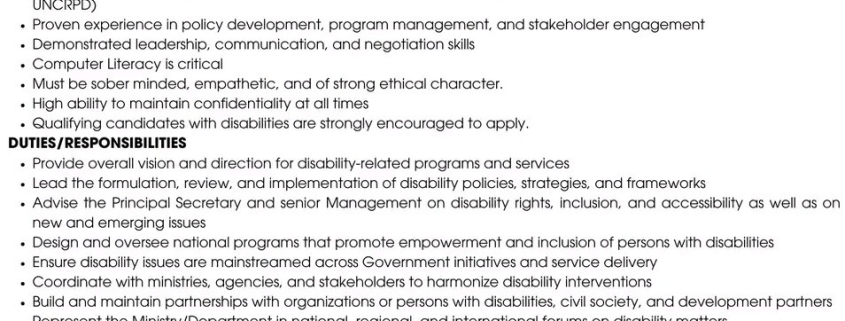 Advise the Principal Secretary and senior Management on disability rights, inclusion, and accessibility as well as on new and emerging issues