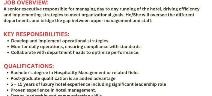 A senior executive responsible for managing day-to-day running of the hotel, driving efficiency, and implementing strategies to meet organizational goals. He/She will oversee the different departments and bridge the gap between upper management and staff.