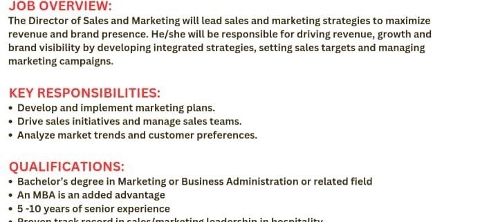 The Director of Sales and Marketing will lead sales and marketing strategies to maximize revenue and brand presence. He/she will be responsible for driving revenue, growth, and brand visibility by developing integrated strategies, setting sales targets, and managing marketing campaigns.