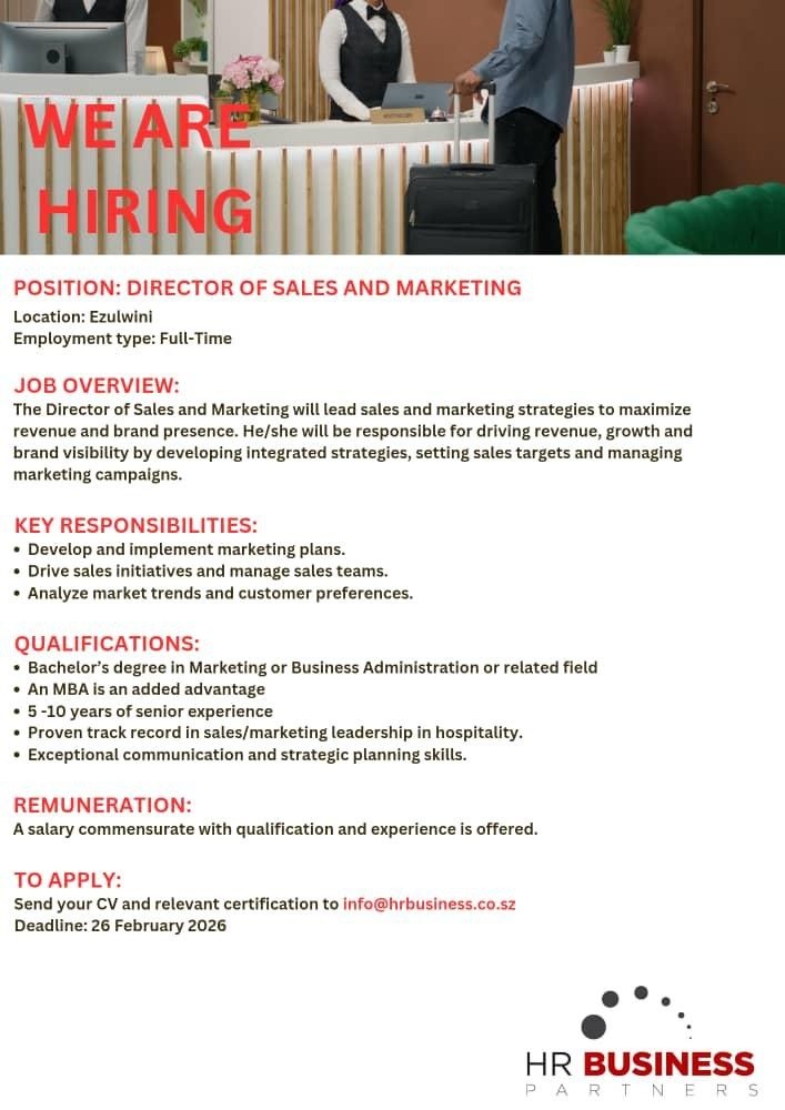 Send your CV and relevant certification to info@hrbusiness.co.sz