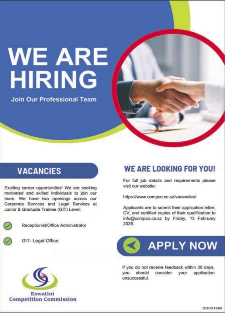 Applicants are to submit their application letter, CV, and certified copies of their qualification to info@compco.co.sz by Friday, 13 February 2026.