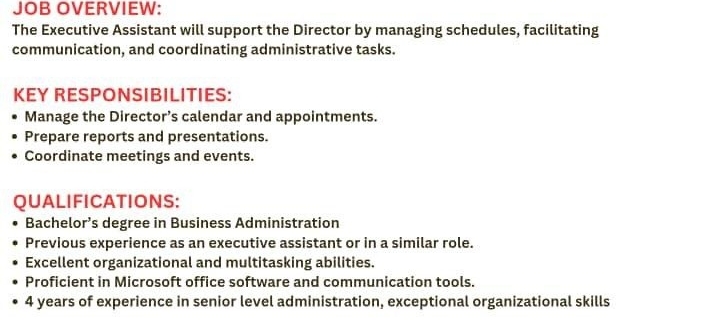 The Executive Assistant will support the Director by managing schedules, facilitating communication, and coordinating administrative tasks.