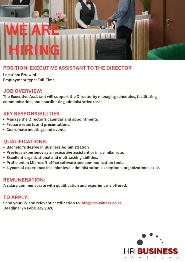 Send your CV and relevant certification to info@hrbusiness.co.sz
