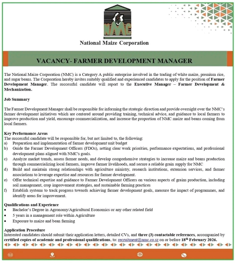 The National Maize Corporation (NMC) is a Category A public enterprise involved in the trading of white maize, premium rice, and sugar beans. The Corporation hereby invites suitably qualified and experienced candidates to apply for the position of Farmer Development Manager. The successful candidate will report to the Executive Manager – Farmer Development & Mechanization.