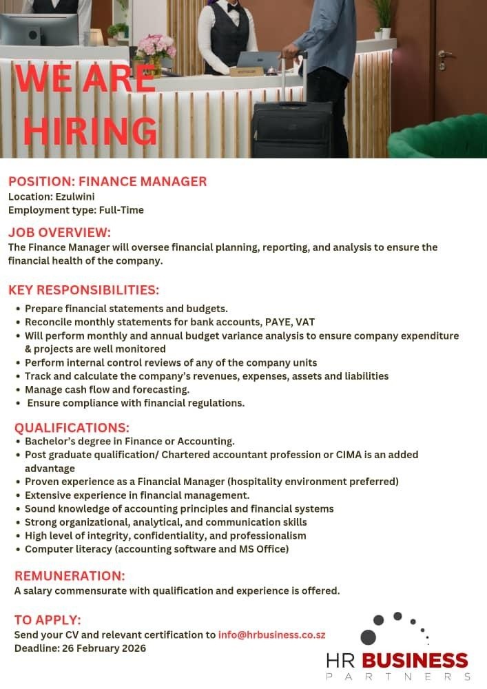 Send your CV and relevant certification to info@hrbusiness.co.sz