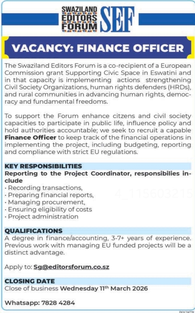 To apply for this job email your details to Sg@editorsforum.co.sz.