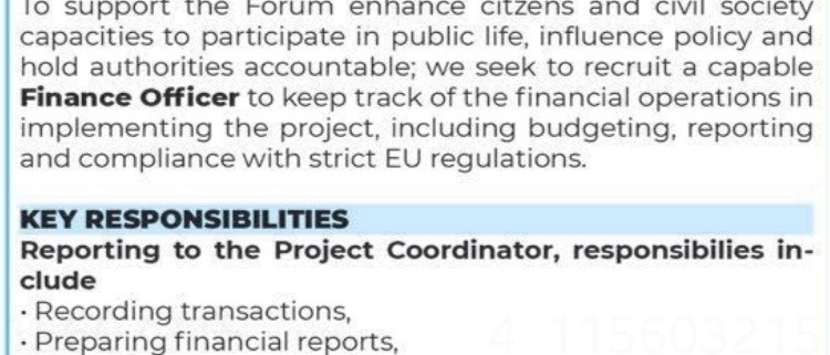 To support the Forum enhance citizens and civil society capacities to participate in public life, influence policy and hold authorities accountable; we seek to recruit a capable Finance Officer to keep track of the financial operations in implementing the project, including budgeting, reporting and compliance with strict EU regulations.