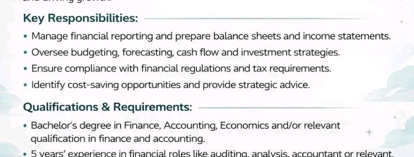 - Bachelor’s degree in Finance, Accounting, Economics and/or relevant qualification in finance and accounting.