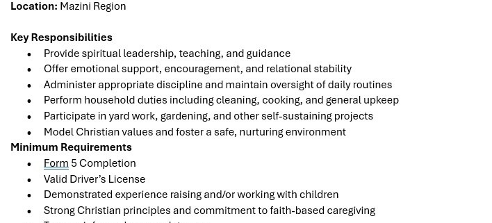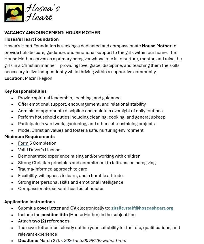 Hosea’s Heart Foundation is seeking a dedicated and compassionate House Mother to provide holistic care, guidance, and emotional support to the girls within our home. The House Mother serves as a primary caregiver whose role is to nurture, mentor, and raise the girls in a Christian manner—providing love, grace, discipline, and teaching them the skills necessary to live independently while thriving within a supportive community.