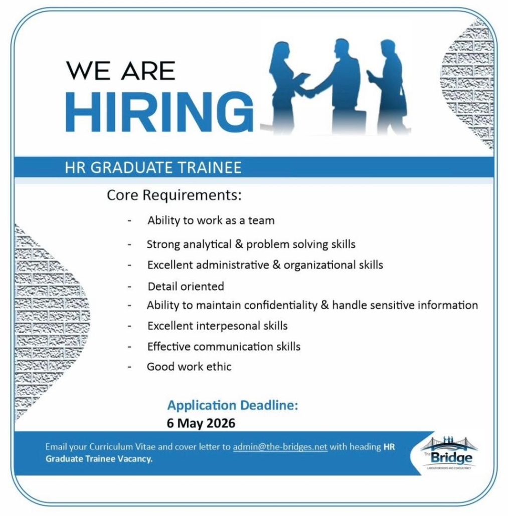 Email your Curriculum Vitae and cover letter to: admin@the-bridges.net with heading HR Graduate Trainee Vacancy.