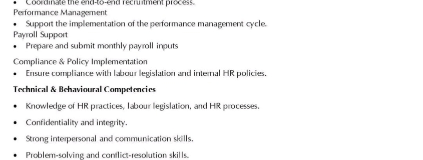 - Knowledge of HR practices, labour legislation, and HR processes.
