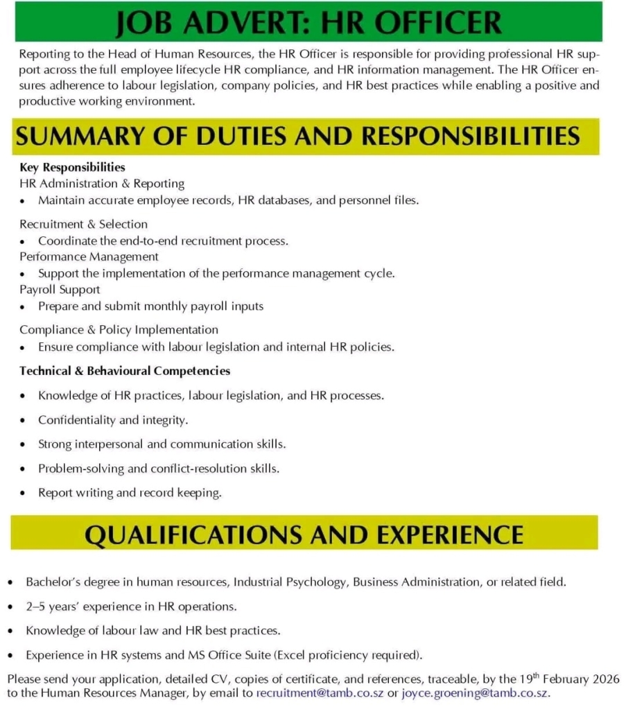 Please send your application, detailed CV, copies of certificates, and references, traceable, by the 19th February 2026 to the Human Resources Manager, by email to recruitment@tamb.co.sz or joyce.groening@tamb.co.sz.