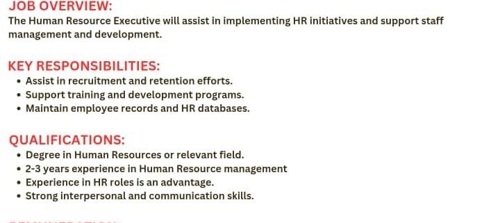The Human Resource Executive will assist in implementing HR initiatives and support staff management and development.