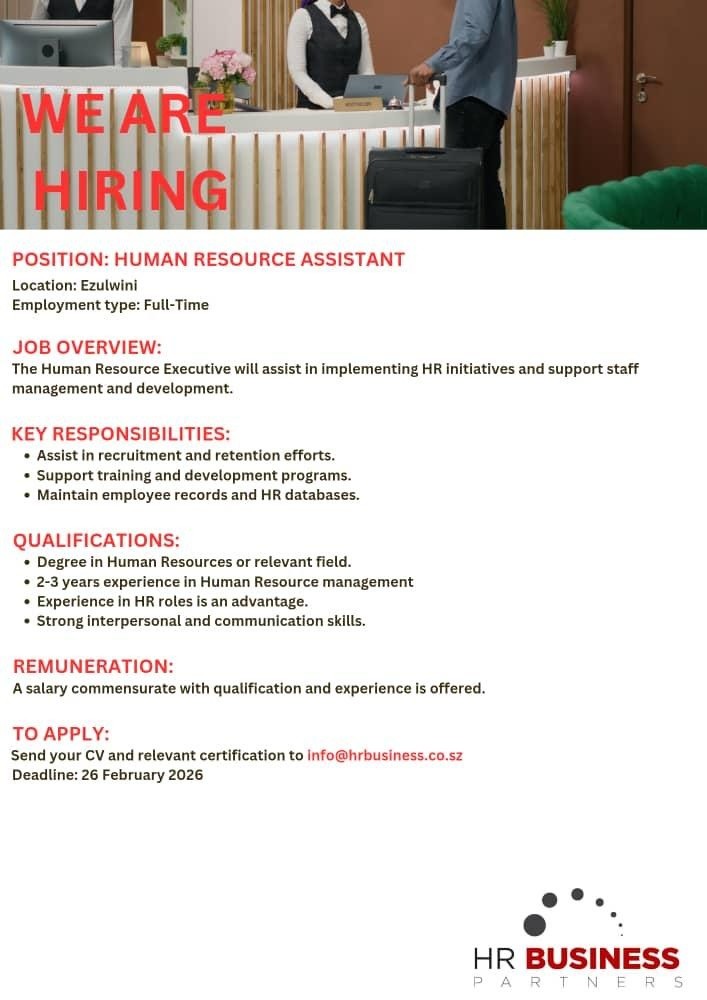Send your CV and relevant certification to info@hrbusiness.co.sz