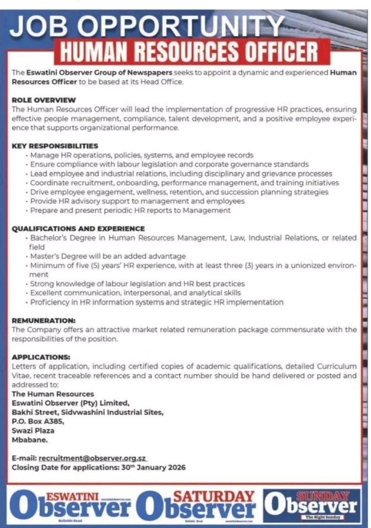 The Eswatini Observer Group of Newspapers seeks to appoint a dynamic and experienced Human Resources Officer to be based at its Head Office.