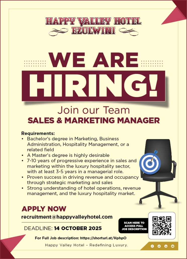 Application letters and curriculum vitae must be sent via to recruitment@happyvalleyhotel.com no later than the 21st September 2025 citing the position applied for, name and surname in the email subject. Only shortlisted candidates will be contacted. If you do not hear from us within a period of two weeks from deadline, consider your application unsuccessful. Thank for your interest in joining our team.