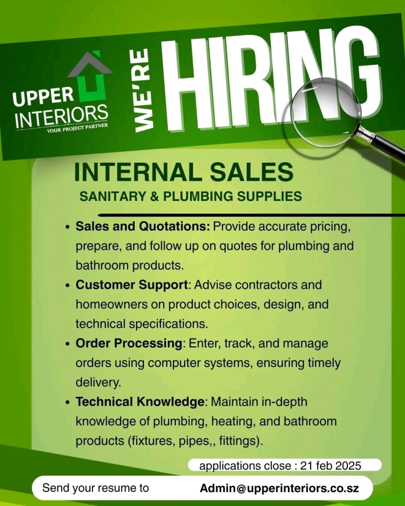 To apply for this job email your details to Admin@upperinteriors.co.sz.