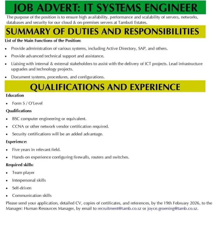 Please send your application, detailed CV, copies of certificates, and references, by the 19th February 2026, to the Manager: Human Resources Manager, by email to recruitment@tamb.co.sz or joyce.groening@tamb.co.sz.