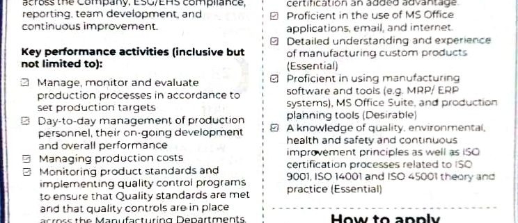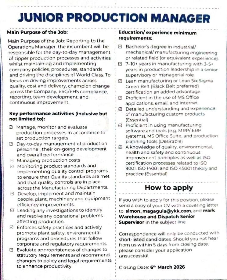Reporting to the Operations Manager; the incumbent will be responsible for the day-to-day management of zipper production processes and activities whilst maintaining and implementing company policies, procedures, standards and driving the disciplines of World Class. To focus on driving improvements across quality, cost and delivery, champion change across the Company, ESG/EHS compliance, reporting, team development, and continuous improvement.