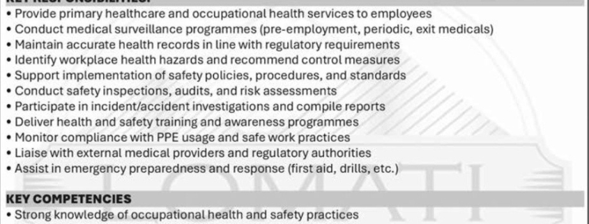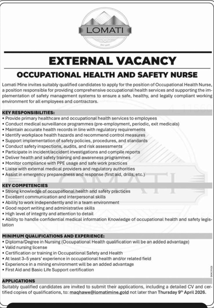 Lomati Mine invites suitably qualified candidates to apply for the position of Occupational Health Nurse, a position responsible for providing comprehensive occupational health services and supporting the implementation of safety management systems to ensure a safe, healthy, and legally compliant working environment for all employees and contractors.