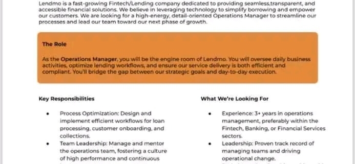 Lendmo is a fast-growing Fintech/Lending company dedicated to providing seamless, transparent, and accessible financial solutions. We believe in leveraging technology to simplify borrowing and empower our customers. We are looking for a high-energy, detail-oriented Operations Manager to streamline our processes and lead our team toward next phase of growth.