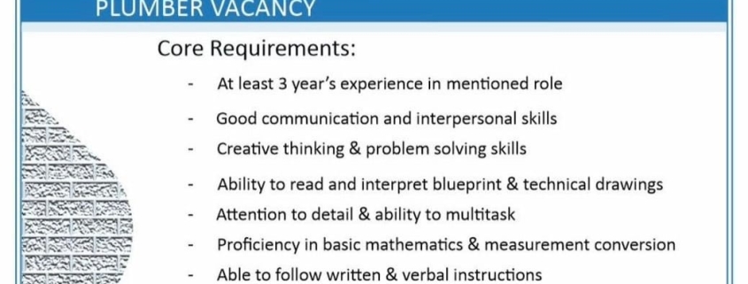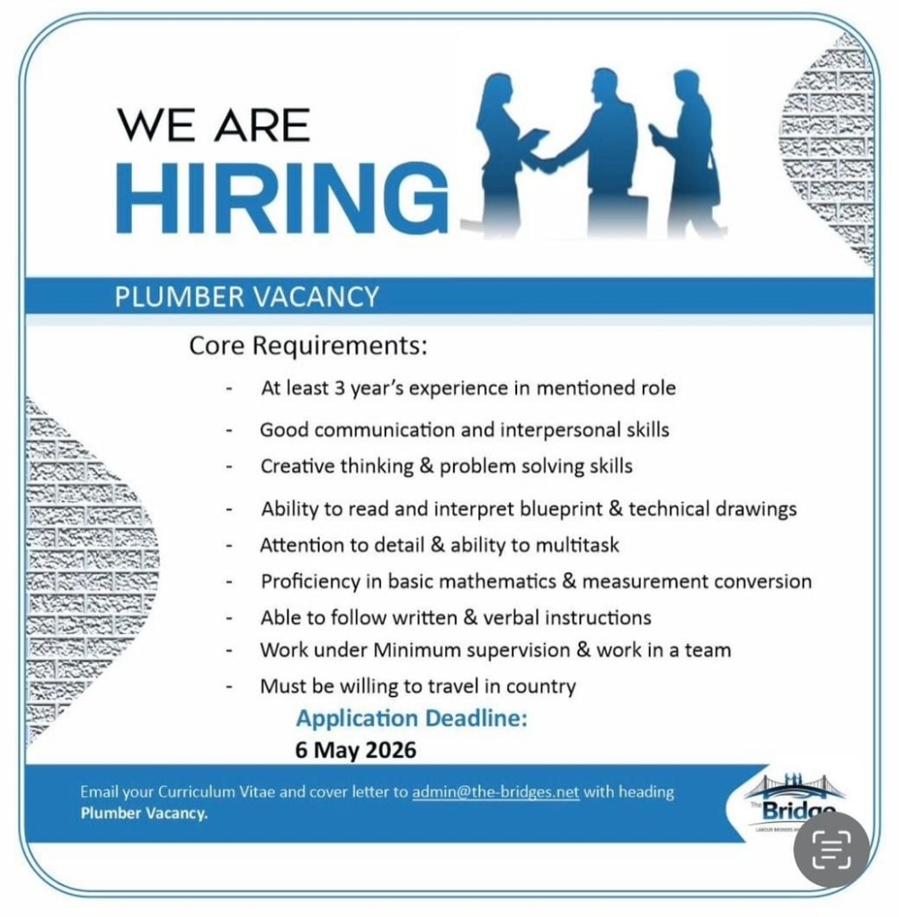 Email your Curriculum Vitae and cover letter to: admin@the-bridges.net with heading Plumber Vacancy.