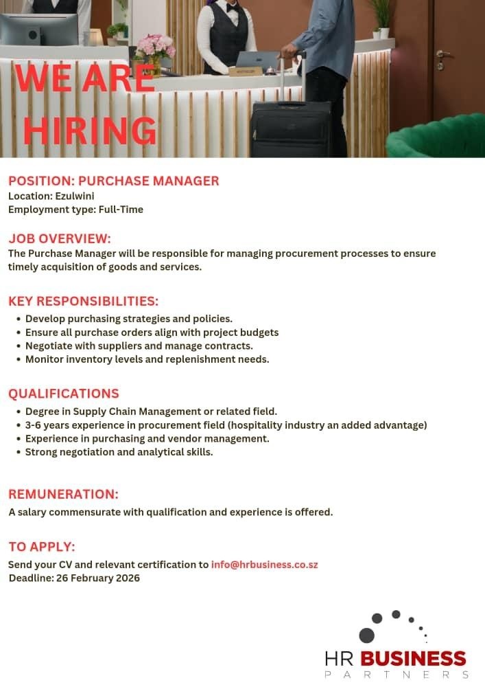 Send your CV and relevant certification to info@hrbusiness.co.sz