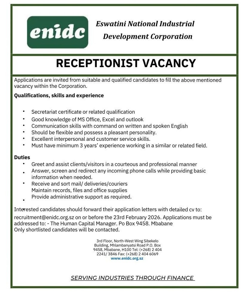 recruitment@enidc.org.sz on or before the 23rd February 2026.